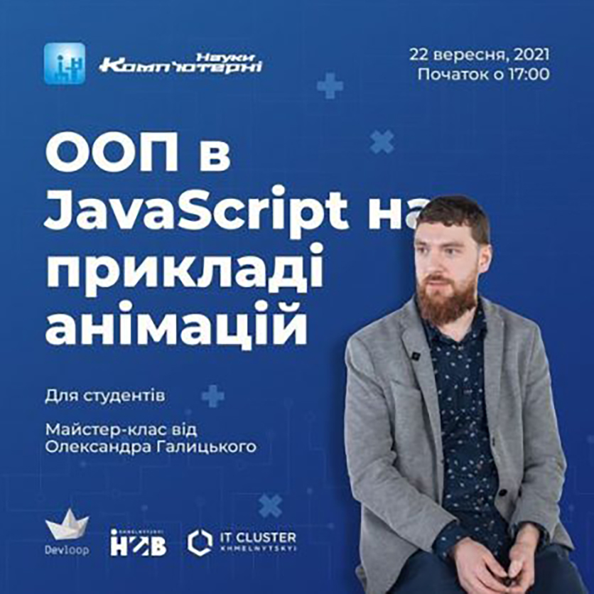22 вересня 2021 за підтримки ІТ-кластеру Хмельницького для студентів проведено майстер-клас “ООП в JavaScript на прикладі анімацій”. Спікер – Олександр Галицький, СТО компанії Devloop. Read More