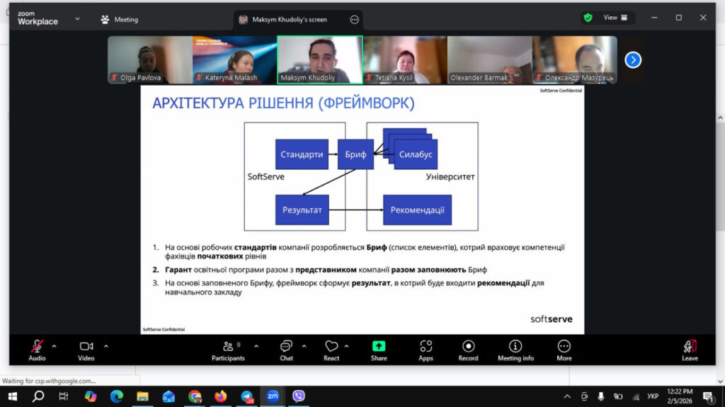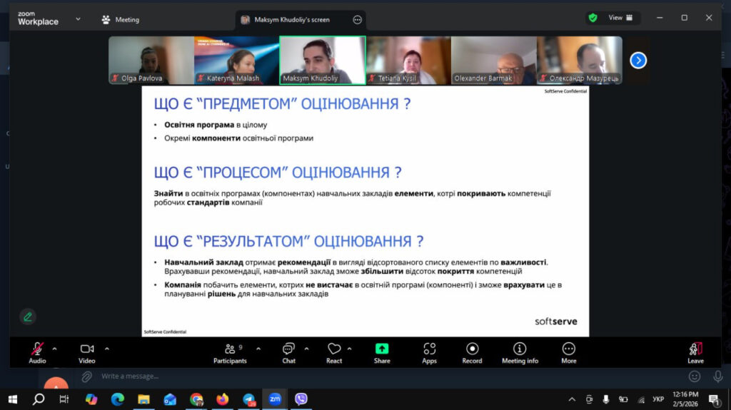 Під час онлайн-зустрічі було представлено підхід компанії SoftServe до зовнішньої оцінки освітніх програм щодо їх відповідності потребам бізнесу. Представники компанії презентували фреймворк, який дозволяє проаналізувати освітню програму в цілому та її окремі компоненти (робочі програми, результати навчання, перелік компетентностей) на предмет покриття актуальних вимог ІТ-ринку.