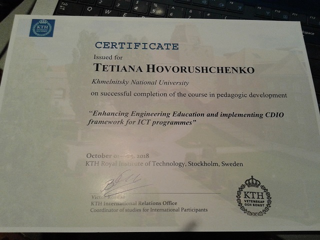 В четвертий та п’ятий дні координаційної зустрічі Т. О. Говорущенко та А. А. Герц взяли участь у навчальному семінарі “Enhancing Engineering Education and implementing CDIO framework for ICT programmes”.