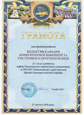 Вітаємо колектив кафедри комп’ютерної інженерії та системного програмування Хмельницького національного університету із 1-им місцем в рейтингу кафедр ХНУ за 2016-2017 навчальний рік у групі “Випускові (фахові) інженерно-технічні кафедри”!